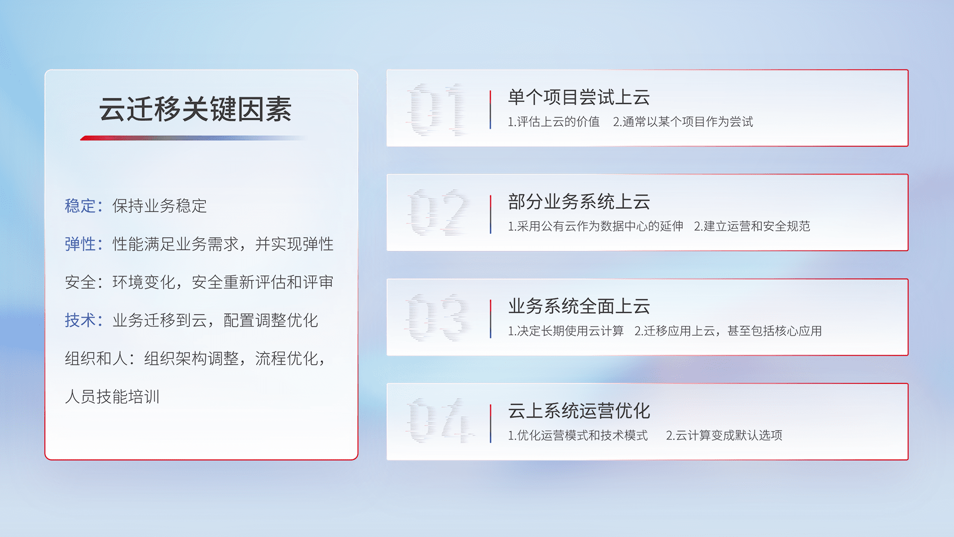 结合实际业务,,从规划设计、、、云平台选型、、云原生改造、、、数据迁移、、、、集成交付,,,,迁移全过程为客户识别最佳上云路径,,,做好风险识别管理,,设计网络架构、、、身份权限、、安全审计合规、、操作审计、、日志审计、、监控告警策略、、多站点容灾设计等,,对云上基础设施进行整体规划,,,,提升IT治理水平,,以满足弹性、、、高可用、、高性能的需求。。。