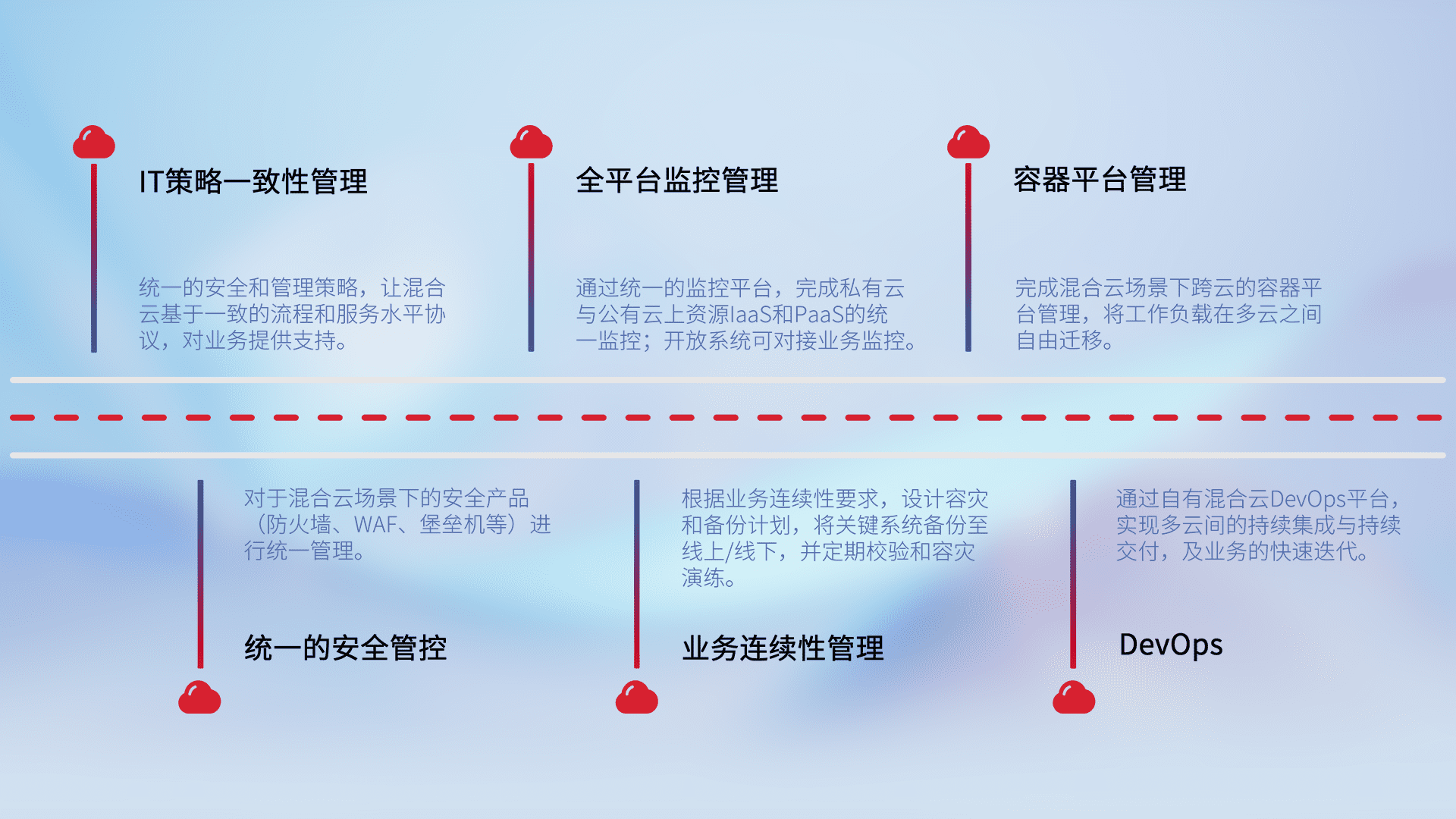 通过多云纳管,,以统一的资源数据模型把客户的云资源进行抽象和封装,,,进而实现对多云资源的统一操作,,保障云资源管理的可靠性、、、稳定性与可用性。。。。量身定制化运维内容,,,,配置、、、、开发运维、、、补丁管理、、、、备份、、监控、、、认证和访问管理、、、、审计和日常巡检等,,,,保障在用云过程中的可靠度,,稳定度以及高可用率。。