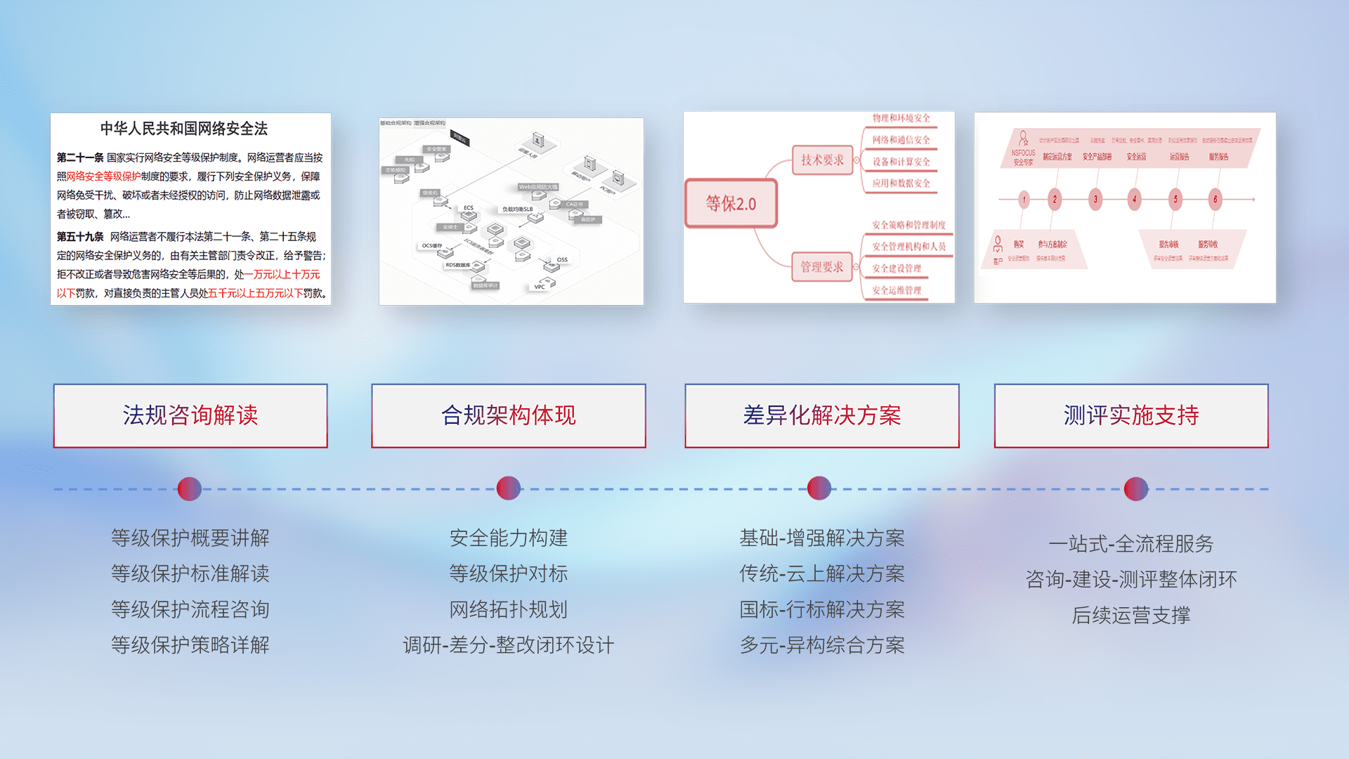 通过专业的法律咨询解读、、、、合规架构体现、、、、差异化解决方案、、、测试实施支持等服务,,,为客户量身打造等保合规体系。。。。